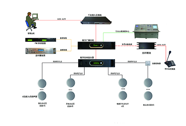近年來(lái),辦公大樓、購(gòu)物中心和其他大規(guī)模建筑工程對(duì)于公共廣播系統(tǒng)能夠具備呼叫分配、播音、背景音樂(lè)及對(duì)建筑物內(nèi)的特定區(qū)域進(jìn)行常規(guī)信息播放的功能之要求日益增加??坪^k公樓廣播系統(tǒng)的設(shè)計(jì),順應(yīng)潮流和科技發(fā)展趨勢(shì),從投資合理、外觀(guān)美觀(guān)、設(shè)計(jì)規(guī)范的設(shè)計(jì)原則出發(fā),要求廣播系統(tǒng)具備如下功能:①兼顧背景音樂(lè)、公共廣播、消防廣播的功能;②全數(shù)字結(jié)構(gòu);③結(jié)合防火分區(qū)劃分廣播分區(qū);④各廣播分區(qū)獨(dú)立音源、獨(dú)立廣播;⑤緊急廣播具備優(yōu)先控制權(quán)。
