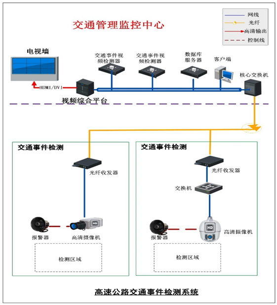 高速公路交通監(jiān)控系統(tǒng)其主要功能是借助現(xiàn)代交通流觀測、誘導(dǎo)與控制的相關(guān)理論,并利用計算機技術(shù)、閉路電視監(jiān)視技術(shù)、信息多媒體技術(shù)等領(lǐng)域的科技發(fā)展成果,對高速公路的交通運營狀況、車輛行駛情況以及道路環(huán)境狀況進行全面觀測,并對沿途車輛的行駛路線、行駛方式進行有效誘導(dǎo)與控制。