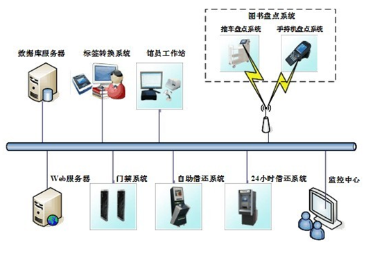 RFID圖書館智能管理系統(tǒng)采用分模塊實(shí)現(xiàn)方式。各個(gè)功能模塊可以單獨(dú)運(yùn)行,也可以組網(wǎng)運(yùn)行,系統(tǒng)模塊架構(gòu)組成包含:出入口RFID門禁認(rèn)證器、讀者自助借閱系統(tǒng)、館員工作站讀取器、便攜式館藏點(diǎn)檢器、智能流通標(biāo)簽轉(zhuǎn)換連接工作站、讀者自助還書系統(tǒng)、手機(jī)移動(dòng)圖書館、智能安全監(jiān)測(cè)系統(tǒng)、應(yīng)用服務(wù)器及借閱信息提示器。整個(gè)圖書館RFID智能館藏系統(tǒng)應(yīng)用軟件包括:智能流通標(biāo)簽初始化轉(zhuǎn)換系統(tǒng)、管員工作站應(yīng)用功能集成系統(tǒng)、讀者自助借閱系統(tǒng)、讀者自助還書系統(tǒng)、手持設(shè)備查詢、順架及盤點(diǎn)系統(tǒng)、安全通道門系統(tǒng)。