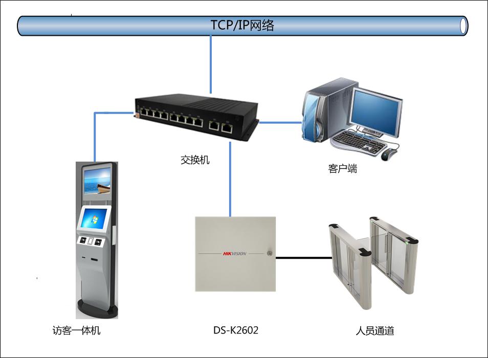 人員出入口控制系統(tǒng)由感應IC卡、感應讀卡器、速通門設備、通道閘控制器、出入口管理軟件及工作站等組成。根據(jù)出入口通道管理需要,設計選用網(wǎng)絡型通道控制主機,通道控制器采用TCP/IP通訊方式進行與上層管理層通訊方式,支持聯(lián)機或脫機獨立運行。每個通道控制器可以控制1個通道,系統(tǒng)架構圖如下: