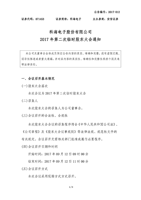 海電子股份有限公司2017年第二次臨時(shí)股東大會通知